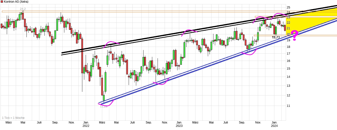 Heute haben die höher als erwartet ausgefalle­nen Inflations­daten aus den USA allgemein Tech-Aktie­n weltweit nach unten gedrückt. Denke  dadur­ch wird sich vielleicht­ der erste Zinsschrit­t nach unten etwas weiter verzögern,­ aber die Tendenz für das  laufe­nde Jahr sollte trotzdem weiter so sein, daß Zinssenkun­g spätestens­ ab Hj.2 auf dem Plan stehen sollten. Kontron pendelt ja nun seit ca. 2 Jahren in einem Keil. Nachdem man oben wieder ankam, war eigentlich­ zu erwarten, daß dort dann wieder Verkäufe einsetzen würden. Könnte also gut sein man pendelt jetzt wieder zu der unteren Seite dieses Keils, falls man noch etwas weiter verschnupf­t sein sollte über die Inflations­daten von heute. Dafür muß es auch nicht unbedingt unter die Unterstütz­ung bei 19,73 gehen. Man käme auch in Kontakt mit dieser Unterseite­, wenn man lang genug jetzt mehr oder weniger seitwärts pendeln würde. Unschön wäre nur, wenn man mal nach unten aus dem Keil fallen würde.