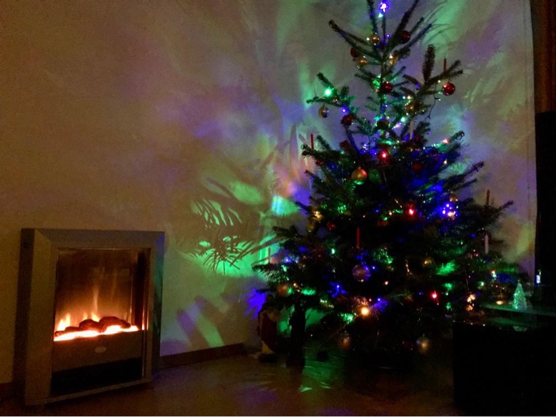 …anbei ein Foto unseres bunten Weihnachtsbaumes, das Elektrocheminée ist der gemütliche Part, projiziert fast realistische Flammen,