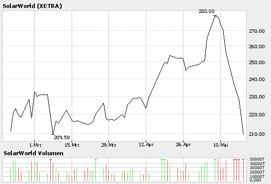 Was Solarworld selbst betrifft: der Titel schien permanent teuer, ob bei Kursen um 100, 150, 200... hat es jedoch immer geschafft, seine Prognosen zu bestätigen bzw. zu übertreffen und steigert sein Wachstum nicht nur operativ, sondern auch durch Akquisitionen, diesen Wert sollte man nicht unterschätzen- ist immer für Überraschungen gut- bin/ war selbst nicht investiert, objektiv gesehen ist der langfristige Aufwärtstrend (siehe 3Jahres Chart) vollkommen intakt und im Vergleich zu ehemaligen NM-Aktien ist das Ende des Wachstums absolut noch nicht in Sicht. Diese Korrekturen hat es immer gegeben und wird es auch immer wieder geben.