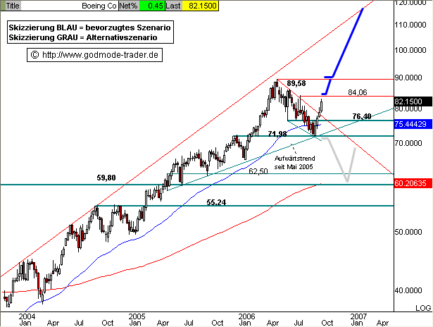 Rückblick: Die Boeing Aktie befindet sich seit dem markanten Tief bei 24,73 $ im März 2003 in einer steilen Aufwärtsbewegung. Im Februar 2006 gelang dann der Ausbruch über das AllTimeHigh bei 70,94 $ aus dem Jahr 2000 und ein weiterer Anstieg bis 89,58 $. Dort startete im Mai eine Abwärtskorrektur bis an die Kreuzunterstützung bei 71,98 $, wo sie im September wieder nach oben drehte und aus dem kurzfristigen Abwärtstrend ausbrach. Das Chartbild ist auf sämtlichen Zeitebenen bullisch zu werten.