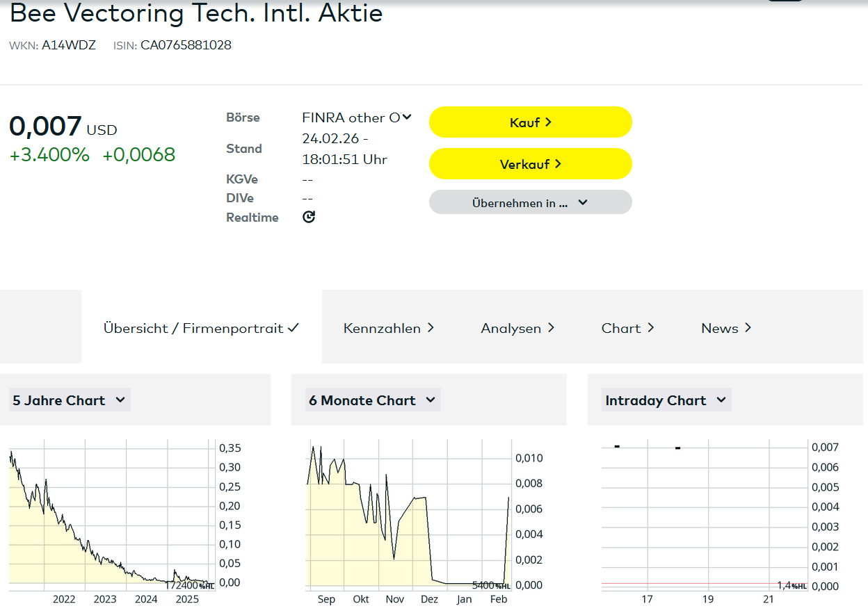WKN: A14WDZ / ISIN: CA0765881028Starkes Volumen bei Bee Vector