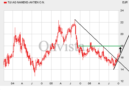 1) Langfristig (2-Jahreschart): der Langfristige Abwärtstrend (1. Hoch: 11.8.2005 bei 22.46€, 2. Hoch: 10.05.2006 bei 17.84€) wurde bereits Mitte September geknackt, als es über 15.7€ ging.