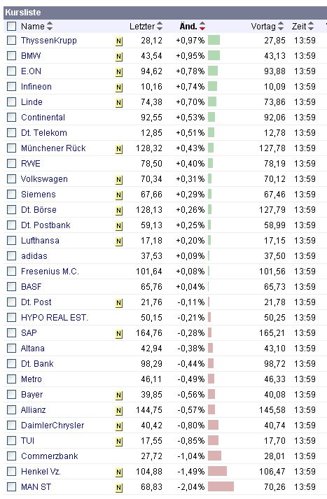 Es gab bei Ariva bis vor einer halben Stunde keinen Intraday-Chart zu TUI. Hier im Thread selbst wird bei "Kurs" eine Silber-Aktie gezeigt. Die Grafik in P. 1552 stammt von Ariva, ist eine Momentaufnahme des Dax zum Zeitpunkt des Postings und zeigt, wie sich die Werte relativ zueinander entwickeln. In dieser Liste steht TUI an der vierten Stelle von unten mit -0,85 %. Das bezieht sich aber offenbar auf die Differenz zum Eröffnungkurs. Ich bin von anderen Chart-Übersichten (bigcharts) gewohnt, die Differenz zum letzten Schlusskurs angezeigt zu bekommen. Falls das Missverständnis darauf beruhen sollte, tut es mir leid. Ich bin der letzte, der hier absichtlich falsche Kurse postet.