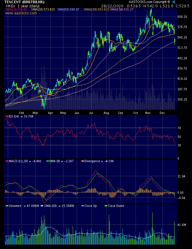 Das Problem, das momentan auf dem Tisch liegt, ist die Unsicherheit ob und wie Tencent von neuen Maßnahmen betroffen wird. Über die Ant Group hört man sehr viel. Die werden demnächst keine Kredite und Versicherungen mehr anbieten können. Wenn ich das richtig mitbekommen habe, soll der Ant nur das Payment Geschäft übrig bleiben. Auf diese Weise werden die Banken in China unterstützt, weil ein potenter Konkurrent aus den Weg geschaffen wurde. Wie hart das aber auf die Tencent ausstrahlt, kann man wenig erfahren. Kommt da eventuell noch was auf die Tencent zu ? Wenn sich das nur auf die Ant Group beschränken würde, wäre der Ausverkauf bei Tencent irrational. Ich finde bis jetzt keine neue Regularien, die Tencent betreffen. Die Tencent wurde bis jetzt nur in dem Zusammenhang mit Alibaba erwähnt, aber direkte Einschränkungen? - Bis jetzt Fehlanzeige. Ob da noch was kommt? Gut möglich, vielleicht war das aber schon.