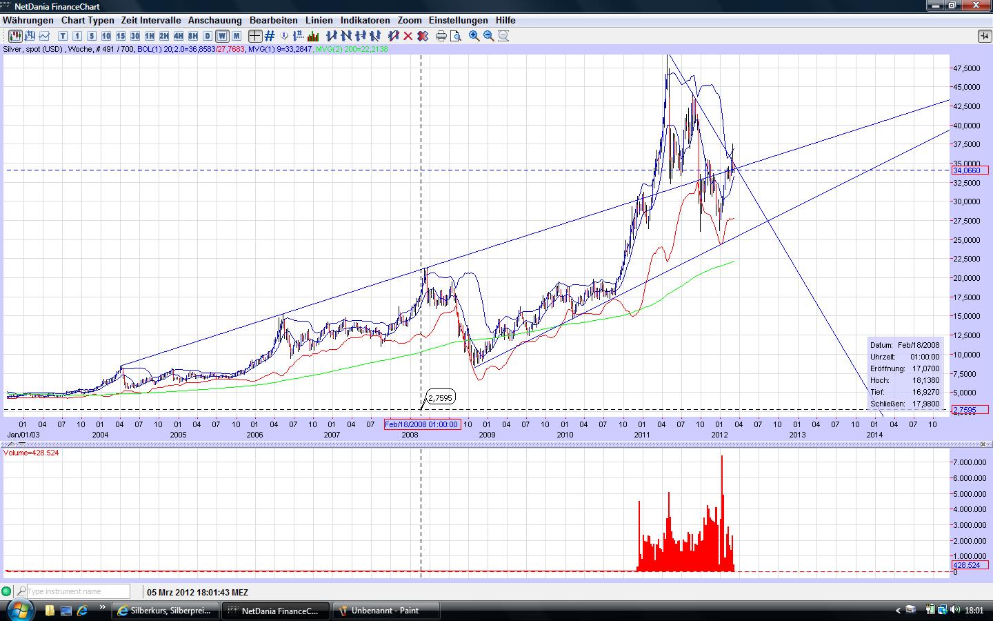 Jetzt sind wir aber in einen Bereich, wo Silber auch einbrechen kann. Sind an der oberen steigenden Begrenzung seit 2004 und den fallenden Trend seit letztes Jahr im Mai. Dazu kommt noch, dass wir den 200er GD nach unten gebrochen haben.