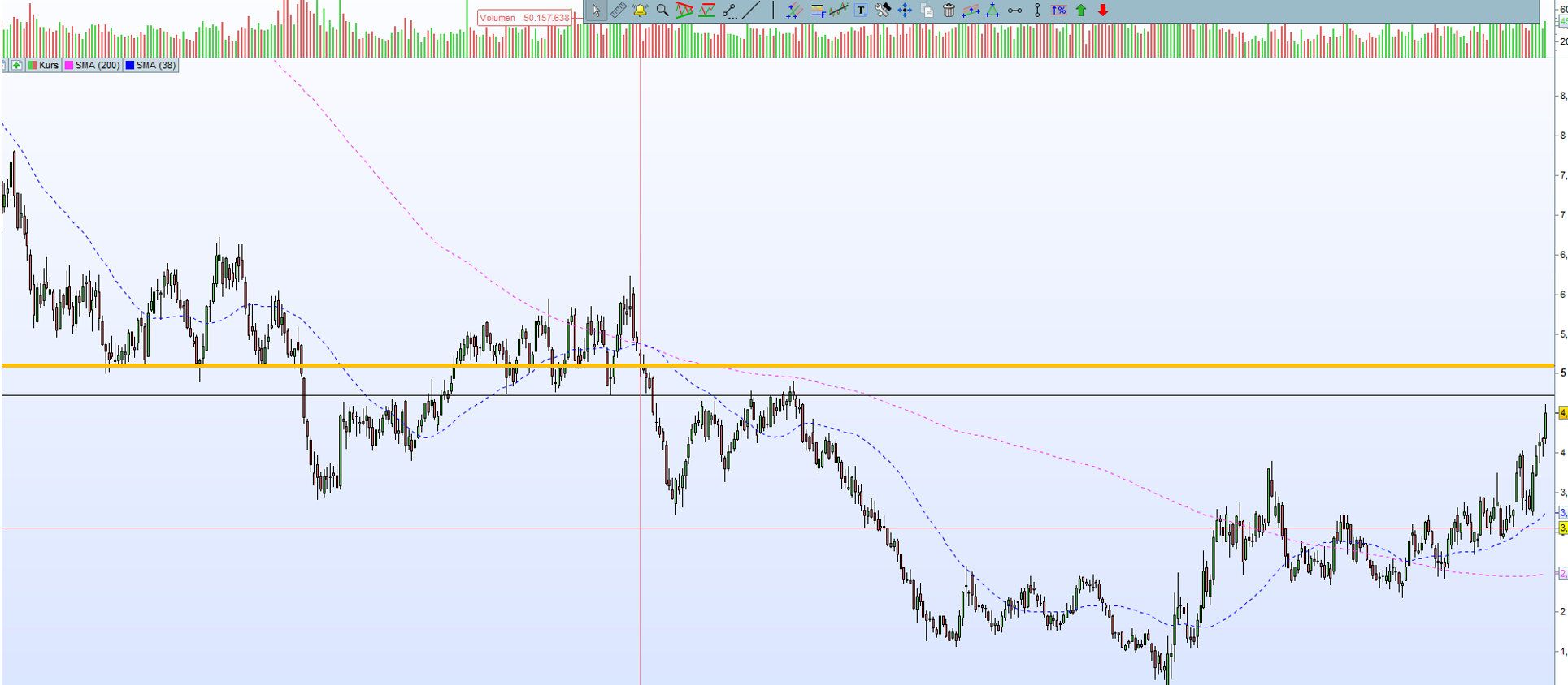 Technisch ist hier ja auf jeden Fall ein Aufwärtstrend da. Ich sehe da auch erstmal nur einen wesentlichen Widerstand in der nächsten Zeit bei $ 5,1. Siehe unten in der Graphik. Andere Meinungen?
