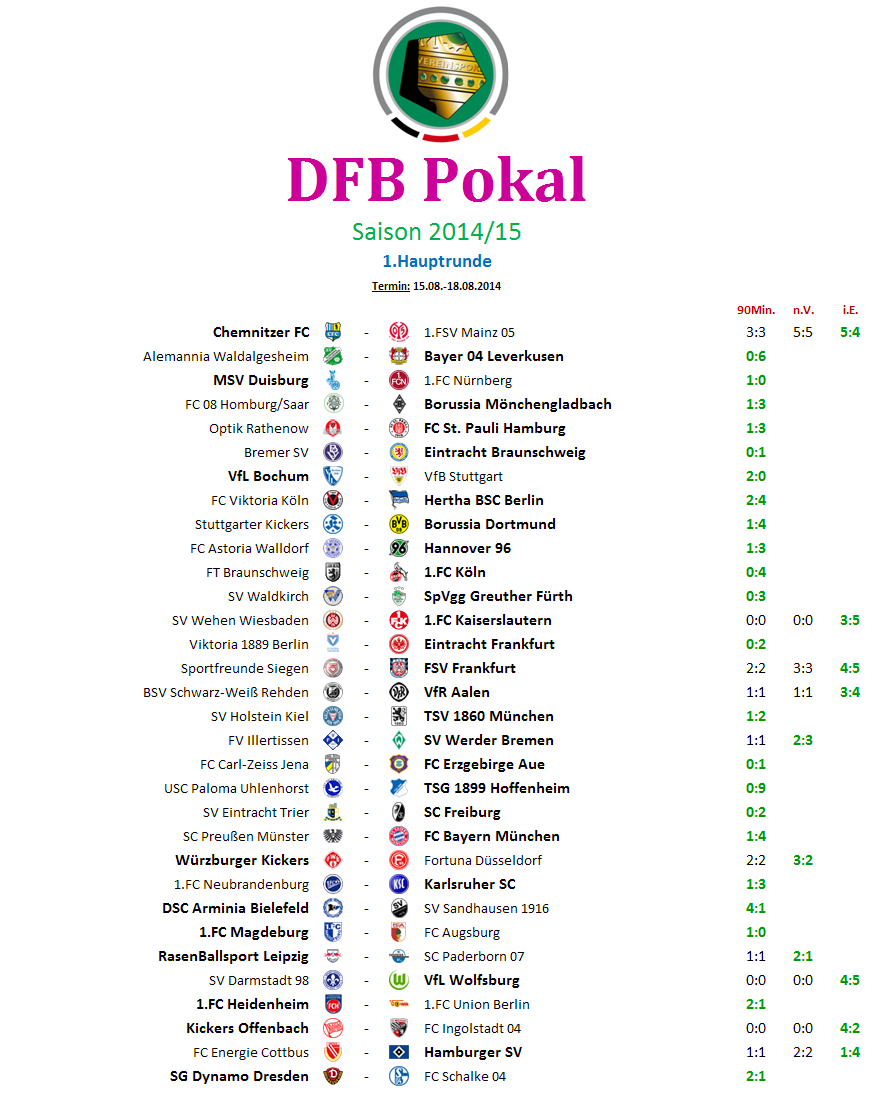 Die Übersicht der 32 Partien 1.Hauptrunde des DFB Pokals 2014/15 zum tippen: