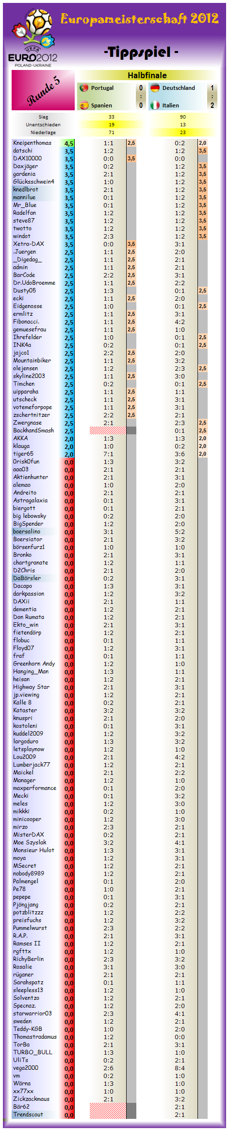 Kneipenthomas gewinnt die 5.Tipprunde / Halbfinale EM2012 mit 4,5 Punkten..