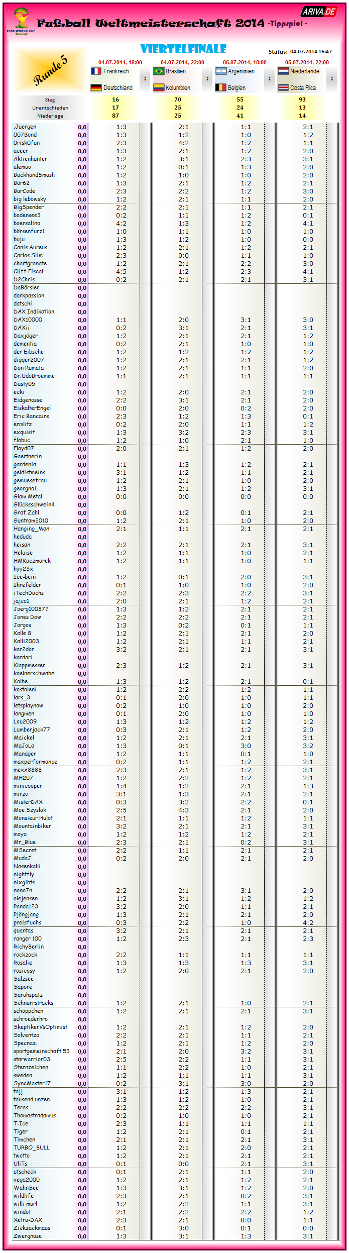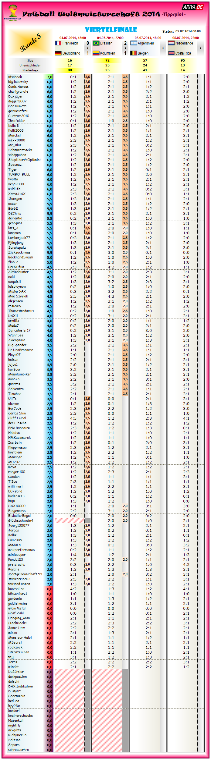 hier nun die abschließende Tageswertung zur Tipprunde 5 / dem Viertelfinale der WM 2014 in der Übersicht...