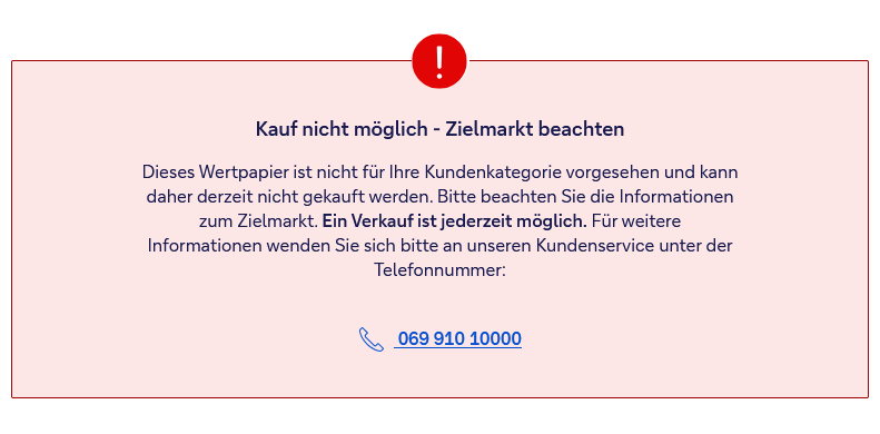 Technisch sauberer klingt es so: Die Deutsche Bank vertreibt ARCC an deine Kundenkategorie nicht, weil sie für dieses Papier keinen passenden Zielmarkt-/Vertriebsweg für Retail hinterlegt hat oder ihn nicht freigegeben hat. Das muss nicht bedeuten, dass das Papier in der EU generell verboten ist.
