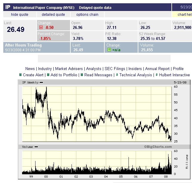Dow-Jones-Aktie "International Paper" (IP). Der Kurs schwächelt seit Jahren wegen des epochalen Niedergangs der Zeitungs-Industrie (daran ist auch Ariva schuld!). Mit aller Kraft versucht die IP-Geschäftsleitung nun, im lukrativen Dollarnoten-Druck verlorenes Terrain gutzumachen.