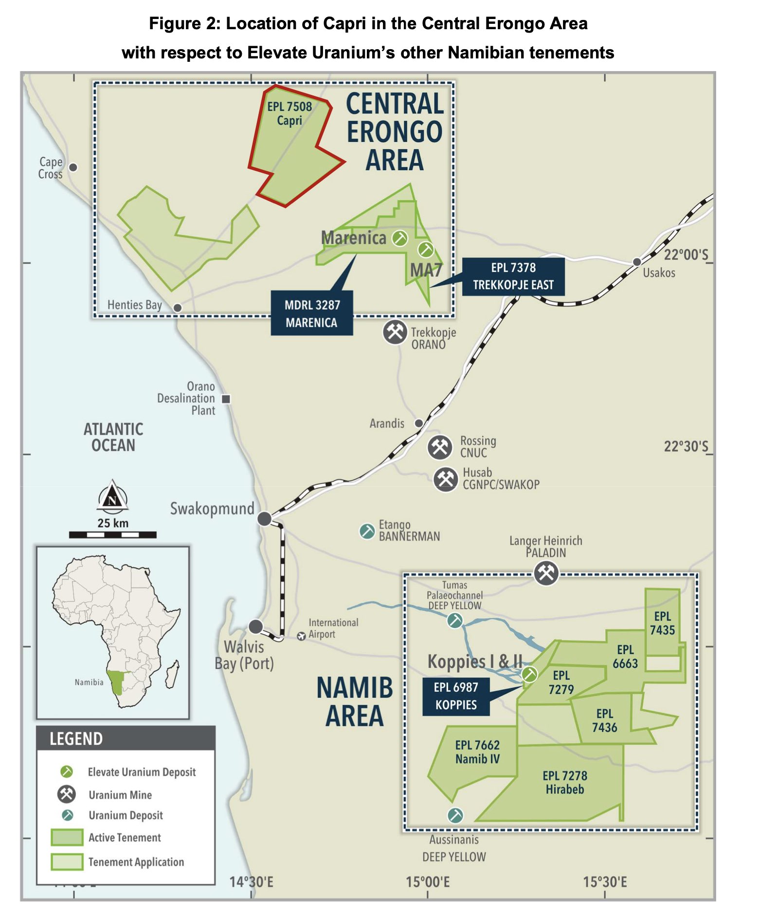 Elevate Uranium Limited (“Elevate Uranium”, the “Company”) (ASX:EL8, OTCQX:ELVUF) is pleased to announce completion of an airborne electro-magnetic survey (“EM”) and radiometric survey flown over EPL7508 (named Capri) in the Central Erongo Area, Namibia (Figure 1).