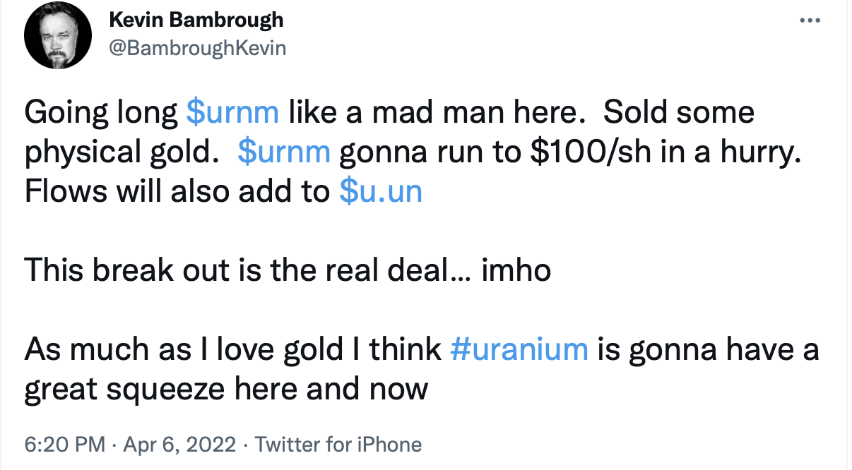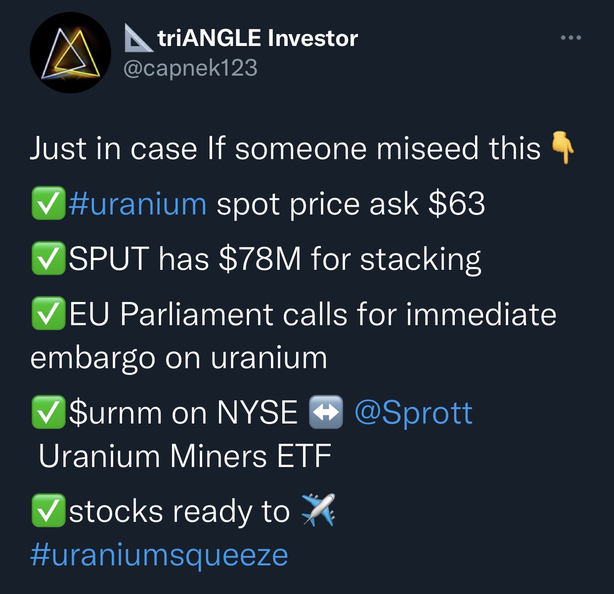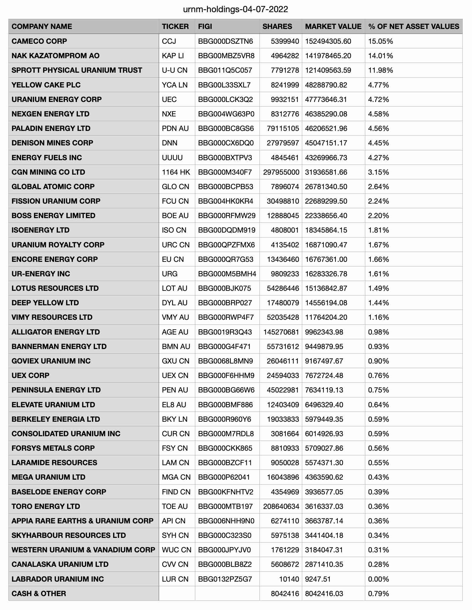 Wenn es richtig zur Sache geht dann werden die Minen mit hohen Ressourcen eine Neubewertung erfahren, anstatt 1$/ ibs werden schnell mehrere $ pro Pfund Uran bezahlt im letzten Bullenrun waren es locker 5$/ibs