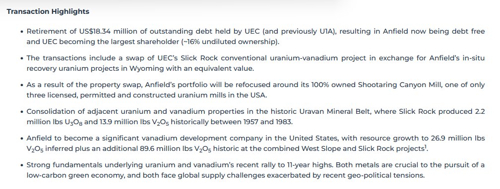 Anfield ist sich mit UEC über die Schuldentilgung einig geworden die Schulden hatte UEC noch von Rosatom übernommen als sie das US Geschäft übernommen haben.