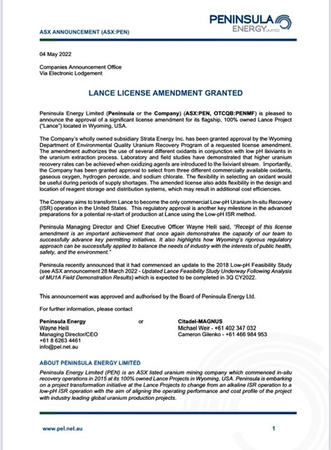 Sollte es zu einem Embargo gegen Russland kommen, so beinhaltet dies auch russische Uranlieferungen für Kernkraftwerke in der EU. Dabei handelt es sich um rund 20 Prozent des Urans der Mitgliedstaaten der EU. Auch verfügt Russland über die größte Anreicherungskapazität weltweit. In den USA haben US-Senatoren einen Gesetzesentwurf zu einem potenziellen Verbot russischer Uranimporte eingebracht. Noch ist es nicht so weit, aber vermutlich ist dies eher eine Frage der Zeit. Da ist es klar, dass Versorgungsunternehmen versuchen ihre Abhängigkeit von Russland zu verringern. Uran aus dem Westen ist also ein gefragter Rohstoff. ..."