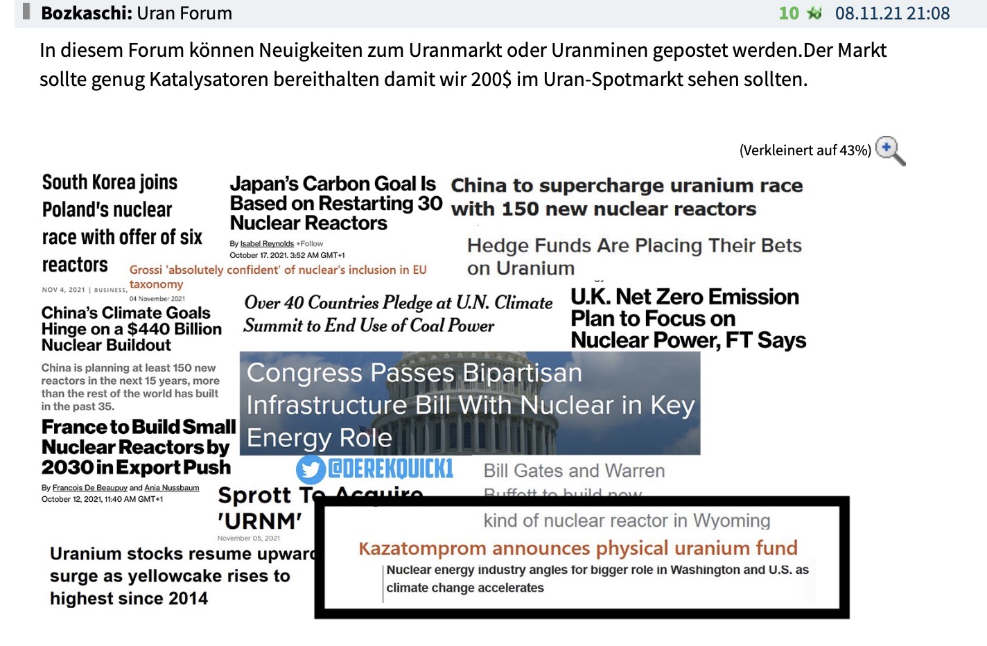Habe all die letzten Wochen, in denen ich tief (mit bis zu 40%) mit meinen Uranaktien im Minus steckte, nicht daran geglaubt, dass sich meine Verluste bei diesen Aktien so schnell wieder reduzieren...das tut gut! Uns allen viel Glück mit unserem Uran-Exposure und bleibt gesund!
