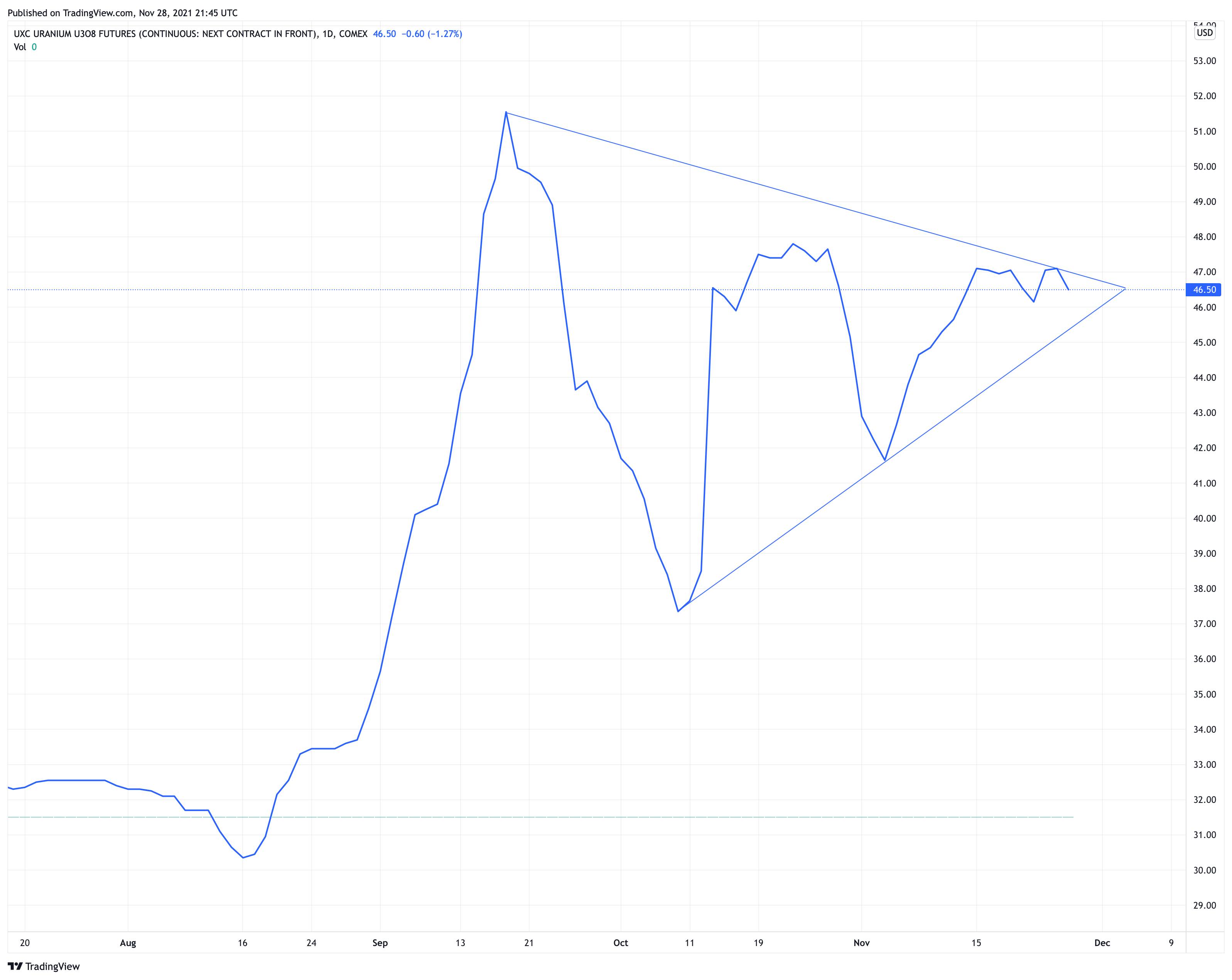 Selbst wenn Uran nach unten aus dem Dreieck ausbringt, sehe ich auf 10 bis 30 Jahre deutlich höhere Preise, allein schon weil hier auch eine kräftige Inflation weitergegeben werden kann, der Mehrbedarf ist eine ganz andere Sache.