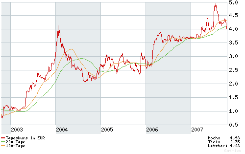 Dann sind 4,-Euro drin oder noch weniger, die alte Seitwärtsbewegung halt, doch so Schwarz wollen wir nicht mahlen.