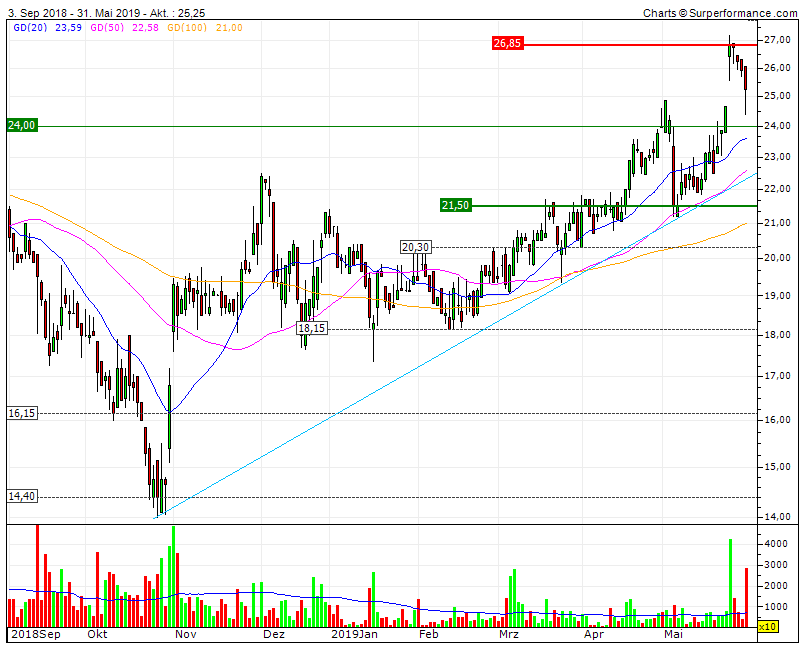 Der Wochenschlußkurs von 25€ macht sich aber auf dem Chartbild sehr gut, denn so wird der alte Widerstand bei 24,90€ herrlich zur Unterstützung.