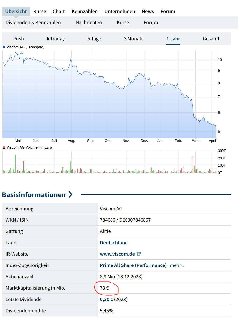 Seit ich die Viscom-Aktie gekauft habe, befindet sie sich im freien Fall. Keine spektakulären Nachrichten, und trotzdem wurde im ersten Quartal etwas Gewinn gemacht... sieht gut aus. Der Kurs sinkt, bzw. bewegt sich seit Monaten kaum. Früher kamen mindestens einmal im Monat Bombennachrichten von einem Großauftrag, jetzt seit fast 1,5 Jahren gar nichts...wie viel Pech kann man haben? Ich habe gesagt, wie bei Wirecard, wenn ich eine Aktie anfasse, das sieht nicht gut aus für dieses Unternehmen...wenn ich jetzt Rheinmetall kaufe, dann ist die Firma in 3 Monaten pleite...