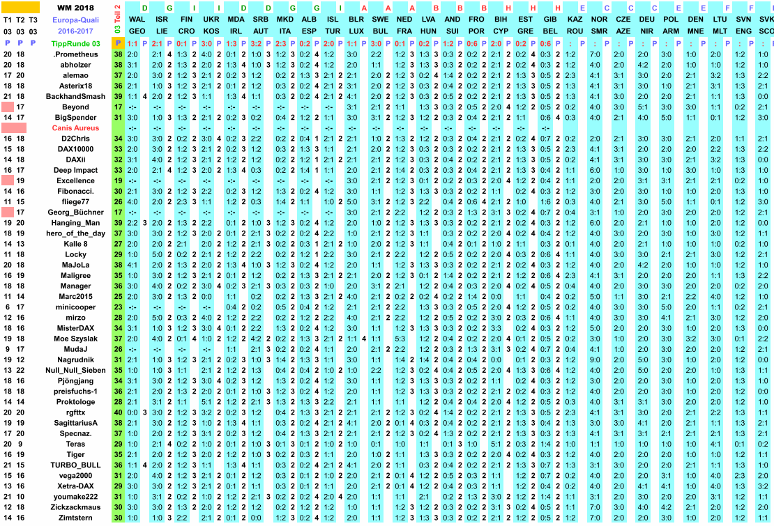 Am stärksten hat es den Canis Aureus nach unten verschoben­, weil er diese Runde 03 complett nicht hat mittippen können. Ich hoffe, dass er in der Runde 04 wieder mitmischt,­ die ja auch schon eröffnet ist:  "WM 2018, Europa-Qua­li 2016/17, TippR 04".