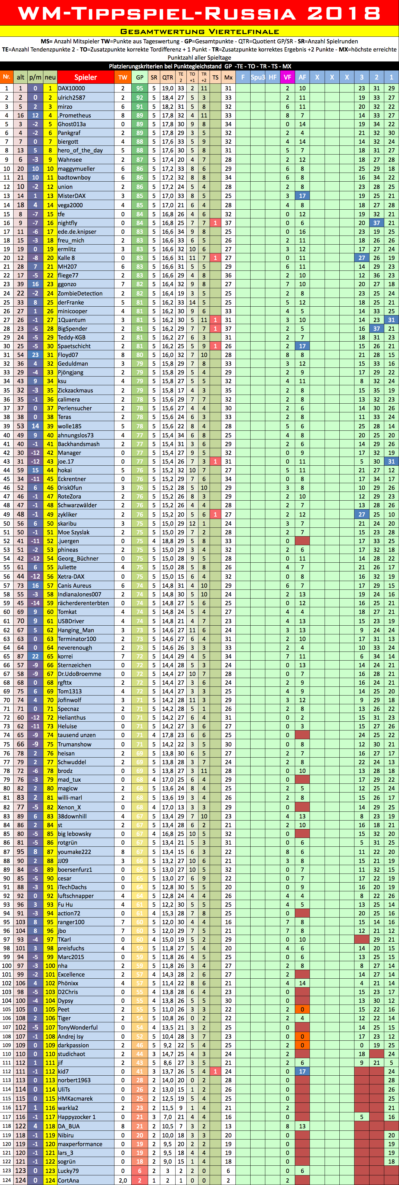 Da die Zeit drängt, wird das Tippen auf das am Freitag (06.07.2018) startende WM-Viertelfinale jetzt schon eröffnet, obwohl das erste TippSheet derzeit noch WildCards enthält. Diese werden aber Zug um Zug durch die dann feststehenden Mannschafts-Namen ersetzt. Verwendet also bitte Alle stets das actuellste TippSheet ! - Tippen oder nachtippen könnt Ihr alle Partien bis 1 Minute vor ihrem jeweiligen Anstoß. Die selbe Frist gilt auch für das Ändern* bereits eingereichter Ergebnis-Ansagen (falls dafür Bedarf sein sollte).