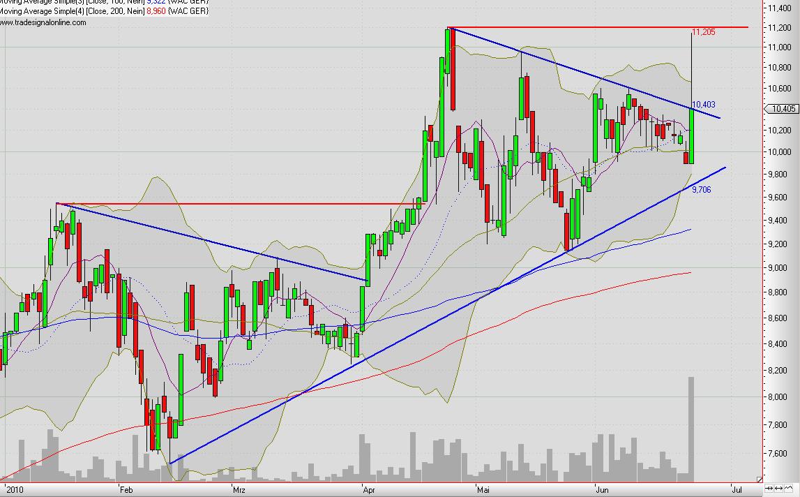 Rückblick: Die Wacker Neuson Aktie pendelte innerhalb der mittelfristigen Aufwärtsbewegung von September bis April seitwärts zwischen 7,85 und 9,50 Euro, bevor Mitte April wieder größerer Kaufdruck aufkam. Die Aktie schoss dynamisch aus der Seitwärtsrange hinaus und kletterte bis ans Kursziel bei 11,01 - 11,30 Euro.