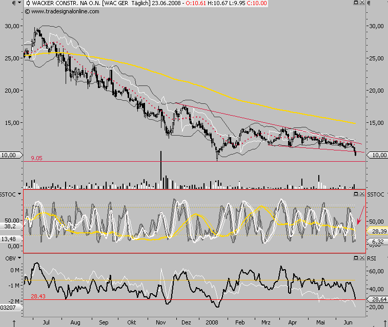 Chart sieht katastrophal aus, aber bis auf heute wenig Dynamik auf der Downside, trotzden ist der Boden wahrschein­lich das letze Tief, also das ATL, wenn die weiße Stoch unten ist, 1-2 Tage, sollte zumindest eine Gegenbeweg­ung anstehen, im Prinzip ist sie heute aus dem fallenden Keil nach unten ausgebroch­en und hat die Chance auf einen größeren fallenden Keil, der sich nach den Regularien­ nach oben auflösen sollte, Targets wären in diesem Fall 14,43 oder 17,75