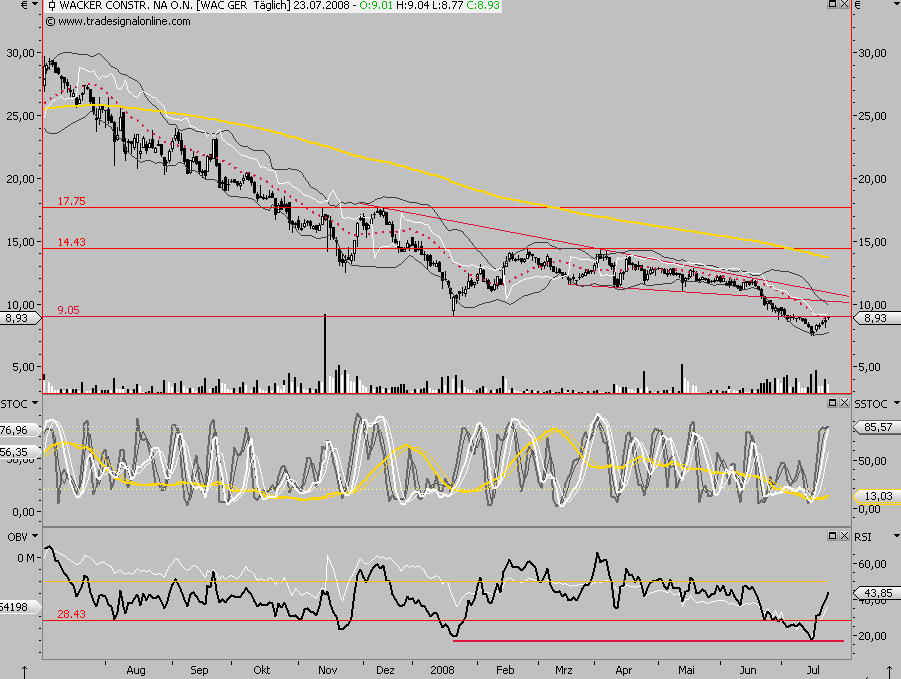 Wacker Neuson ein Schnäppchen Ich sehe dies auch wirklich so und habe gekauft. Leider ist dies für die, die 2007 mit Lobpreisun­g des Vorstandes­ gekauft haben, nicht so. Viele kleine Anleger aus dem Firmenverb­and schauen jetzt dumm in die Röhre.Die Veräusseru­ng der Aktien war ja erst ab 01.01.08 möglich, aber da gings ja schon abwärts.