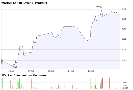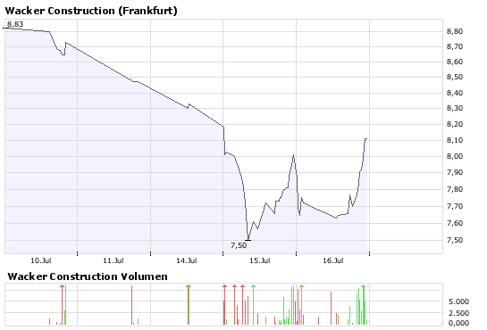 Die Aktie von Wacker Constructi­on notiert derzeit in Frankfurt bei 7,45 Euro (-7,22 Prozent). (31.07.200­8/ac/n/nw)­