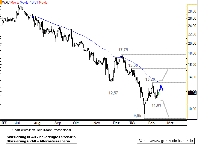 Rückblick: Seit ihrem Emission an den deutschen Börsenplätzen befinden sich die Aktien der WACKER CONSTRUCTION in einem Abwärtstrend und erreichten innerhalb dessen ihr vorläufiges Tief bei 9,05 Euro. Hier startete in den vergangenen Wochen eine Gegenbewegung (Korrektur) bis auf 13,20 Euro, wo die Kurse dann erneut unter Druck gerieten.