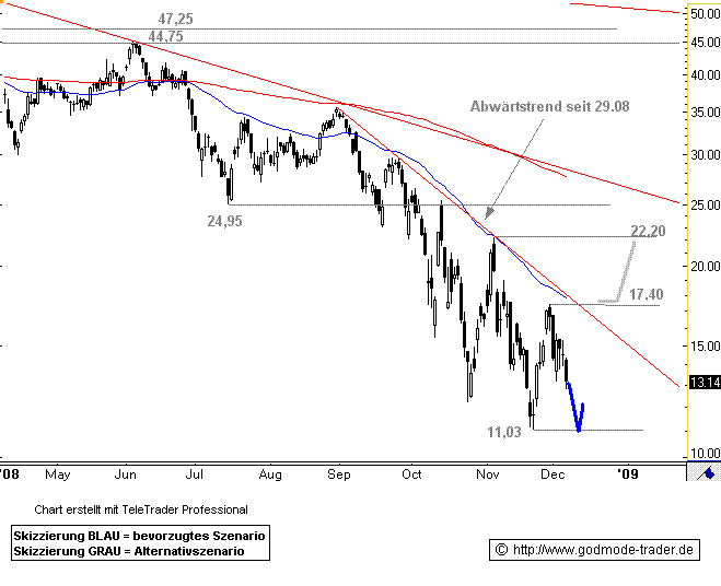 Allerdings erreichte sie damit nicht einmal den steilen Abwärtstrend seit 29.08.2008. Knapp unterhalb dieses Trends drehte die Aktie nach unten ab. Die Bären haben also wieder das Ruder in die Hand genommen.