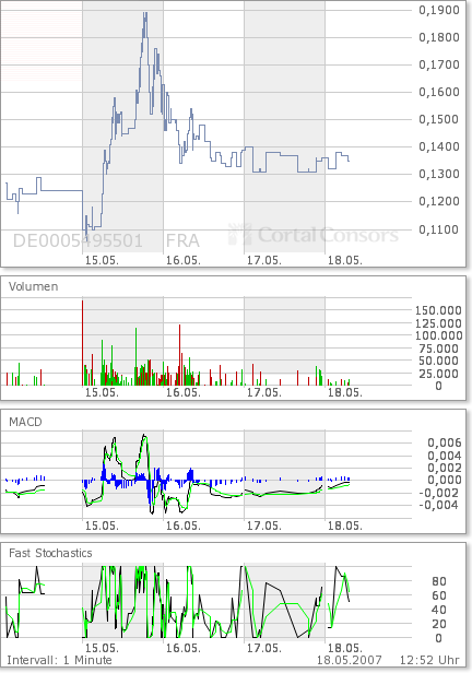 na sehen wir nun noch die 13 von oben. Ab wann springen die ganzen Zocker auf? Bei 13 oder erst über 15 Cent? Ja wenn man das im vorraus wüsste. Vor allem geht es langsam Hoch seit Tagen und das alles ohne News. Da wird doch auch kein andere schon etwas mehr wissen, als die Allgemeinheit. Wäre ja mal wieder mehr als typisch.