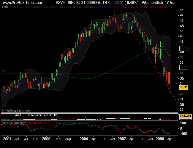 Hier der weekly zum obigen ETF, 33 ist eigentlich ein solider Boden, da könnte das Messer noch ein, zwei Mal abprallen. Eigentlich eine nette 10% kurz-Speku, oder aber längerfristig erste Positionen aufbauen, wie's der Buffet macht :-))