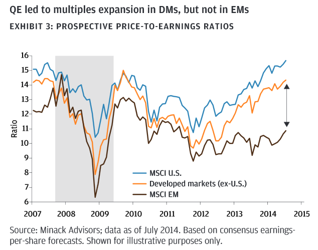 wem der DAX mittlerweile zu teuer erscheint, der sollte über die Emerging Markets nachdenken. Wie im Chart schön zu sehen ist (Research von JPM unten verlinkt), haben die EMs einiges aufzuholen. JP Morgan argumentiert, dass nicht nur die Bewertung (KGV) günstig ist (insbesondere Osteuropa), sondern auch die Nachwirkungen von den QE-Maßnahmen der entwickelten Länder positiv wirken werden.