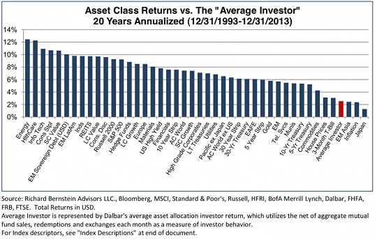 zum thema privatinvestoren. an der graphik unten sieht man die durchschnittperformance des durchschnittlichen investors. diese liegt bei 2 % p.a., und das ist weit unter dem S&P 500, schlechter ist nur noch (!) inflation und japan.