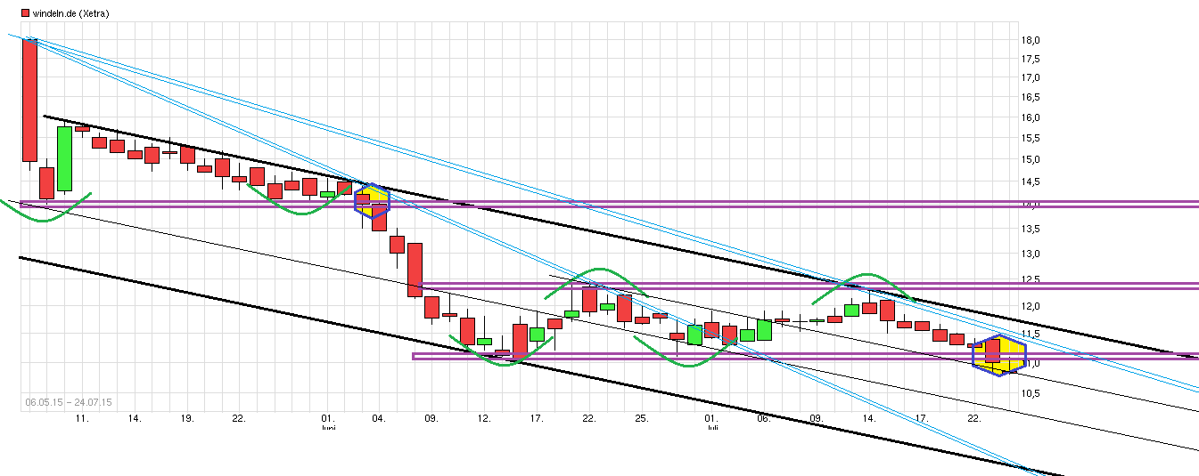 Schlußkurs heute quasi auf neuem Allzeittief. Boden scheint also noch nicht gefunden zu sein. Wenn die Tendenz der letzten Tage so weitergehen sollte, dann käme man wirklich in die Nähe zur Einstelligkeit. Dann wäre auch der letzte der 5 Long-Scheine von L&S im Jenseits. Vielleicht sollte man spätestens dann Long gehen, wenn L&S auch mal erste Short K.O. Scheine auflegt ;);) Wie dem auch sei, jetzt muß erstmal irgendwo in tragbareren Regionen ein Boden gefunden werden. Ob der bei 11€, 10€, 9€ oder sonstwo sein wird bleibt anzuwarten. Denke aber irgendwann wird auch hier mal zumindest eine technische Gegenreaktion überfällig werden. Von daher mal schauen was passiert, falls der untere Bereich des eingezeichneten Abw.trendkanals tangiert würde. Wobei natürlich ansgesicht der sehr kurzen Zeit die der Chart erst läuft, die Chartanalyse nur begrenzt schon aussagekräftig ist.