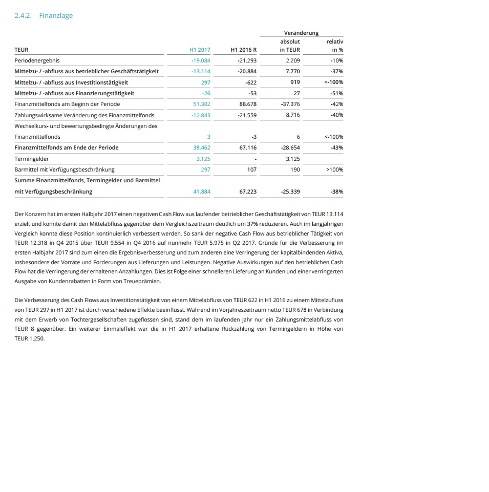 "... Die liquiden Mittel (inkl. Termingelder und Barmittel mit Verfügungsbeschränkung) des Konzerns beliefen sich zum Stichtag 30. September 2017 auf 31 Mio. Euro. Diese Position war um 11,3 Mio. Euro niedriger als zum Ende des zweiten Quartals..."