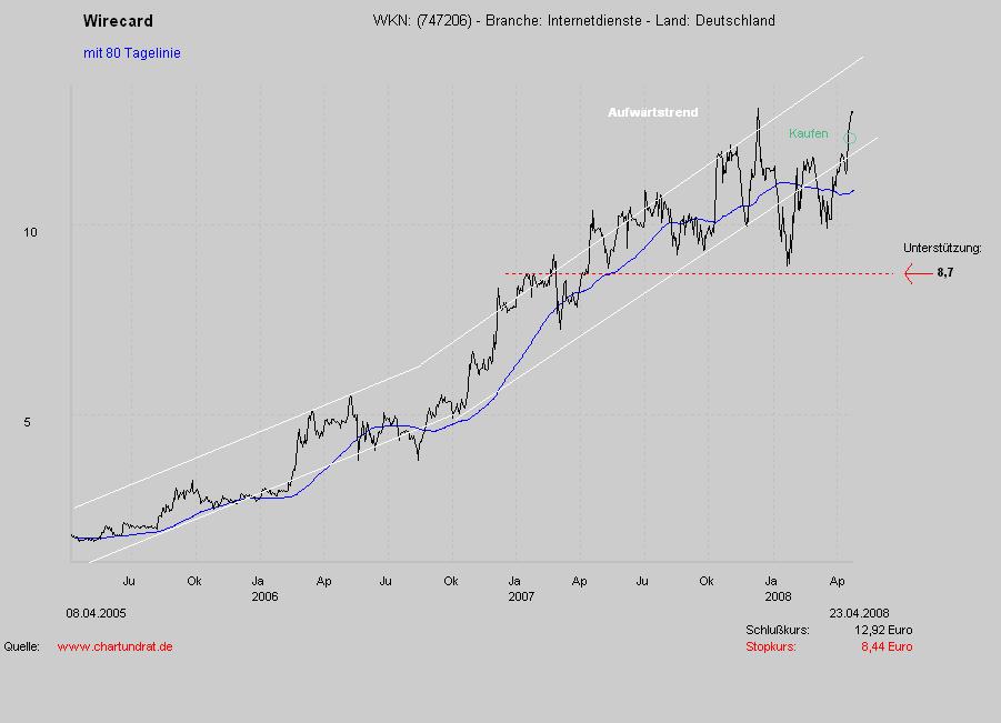 Die Wirecard Aktie bewegte sich in einem langfristigen intakten Aufwärtstrendkanal. Aus diesem ist sie signifikant nach unten ausgebrochen, jedoch im weiteren Verlauf (am 17.04.2008) erneut in den Aufwärtstrendkanal eingetreten. Dadurch hat sich das Chartbild verbessert, denn es besteht nun die Hoffnung, dass die Aktie Ihren langfristigen Aufwärtstrend fortsetzt. Erst bei einem weiteren signifikanten Ausbruch aus dem Aufwärtstrendkanal würde sich das Chartbild verschlechtern. Die Kursentwicklung bestätigt somit den bisher aussichtsreichen Chartverlauf. Aus diesem Grund können die Aktien-Positionen wieder unter Beachtung der Indikatorenanalyse aufgebaut werden.....