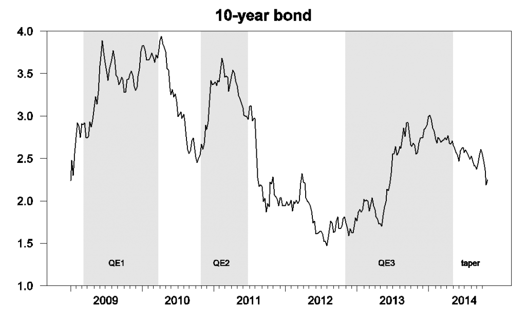 QE ist bekanntlich eine in der Zeit gedehnte Open Market Op, die - bilanzneutral - Bonds im Tausch gegen Reserves aus dem Markt nimmt. Die Denkidee dahinter ist, damit das allgemeine Zinsniveau zu drücken und so die Kreditvergabe zu stimulieren. Der Denkfehler hinter dieser Denkidee ist, die Kausalität zwischen Kreditvergabe und Zinsentwicklung - wie im Monetarismus üblich - auf den Kopf zu stellen. Ein Effekt auf den Zins ist eben deshalb auch nicht festzustellen: