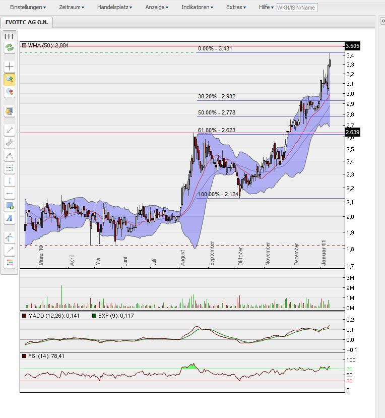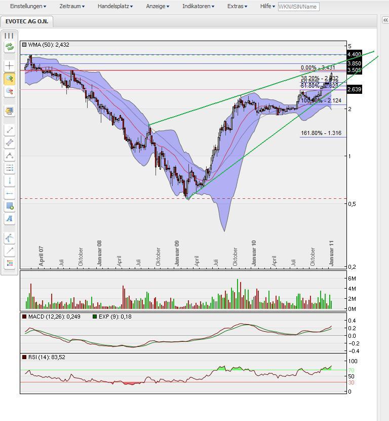 kurzfristiges chartbild ist überkauft und aktuell aus dem oberen bollinger band raus gelaufen. das retraicement der aufwärtsbewegung seit okt. 2010 zeigt eine mögliche problemlose korrektur bis in den bereich 2,93 € an. darüber liegen noch das mittlere bollinger band und der moving average 50. beides stark steigend. eine korrektur bis unter 3,- daher unwahrscheinlich, ABER möglich. kurzfristiges ziel wäre bei 3,50 € aus dem Nov. 2007, zusätzlich psychologisch wichtig.