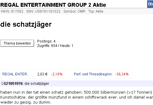 haben nun in der tat einen schatz gehoben: 500.000 Silbermünzen (>17 Tonnen) + Kunstschätze. der größte münzfund in einem schiffswrack ever. und ich dämel war mal wieder zu geizig. zu dumm.