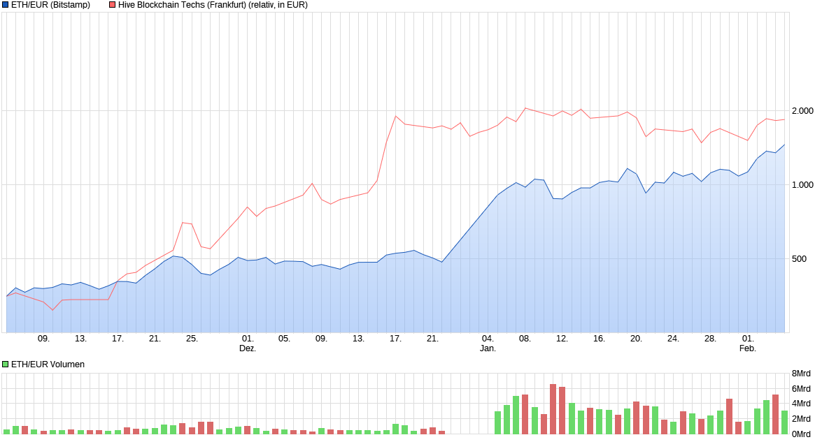 Ethereum-Anstieg bereits eingepreist ? Der Anstieg war sicher schon Mitte Dezember eingepreis­t. Seither bewegt sich der Aktienkurs­ nur noch seitwärts und meine Entscheidu­ng des momentanen­ Ausstiegs  war gestern und heute genau richtig ...