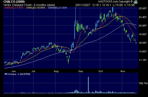 halco (2600.HK) off 2.7% at HK$15.20 as investors concerned Beijing's tightening measures may have negative impact on metal demand; on Tuesday company raised price of spot alumina for second time in three weeks to reflect tightening supply. Still China Construction Bank International Securities analyst Duncan Chan says, "although the price rise will not have a significant impact on Chalco's 2007 earnings, the move signals the market's outlook is improving." Chalco is selling its spot alumina at CNY4,200 per metric ton, up 10.5% from CNY3,800/ton.