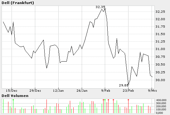 Die Aktie von Dell schloss am Donnerstag an der NASDAQ bei 31,96 Dollar. Nachbörslich verbessert sich der Titel um 2,25 Prozent auf 32,68 Dollar.