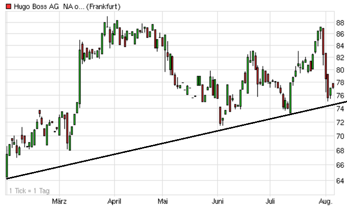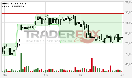 Die Aktie von Hugo Boss legte in den letzten Tagen deutlich zu und steht nun knapp unterhalb eines sehr wichtigen Widerstands bei 83,52 Euro. Gelingt der Aktie ein Ausbruch über diese Marke, dann wäre eine weitere Rally in Richtung 89,76 und später sogar ca. 90,00 Euro möglich. Sollte der Wert allerdings unter 79,52 Euro abfallen, dann müssten wohl einige Bullen ihre Positionen schließen.
