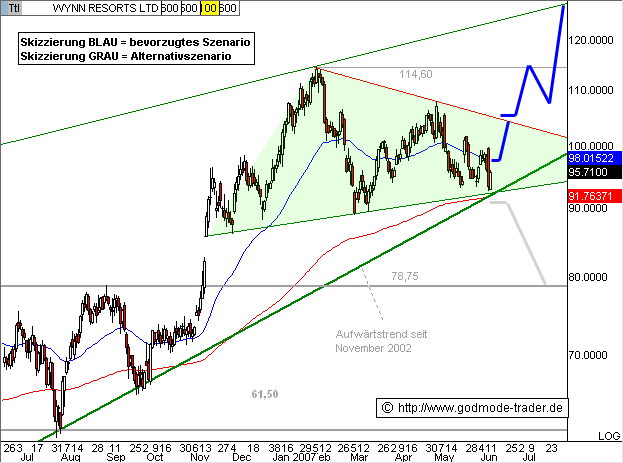 Rückblick: Die WYNN Aktie befindet sich in einer steilen, langfristigen Kursrallye. Das AllTimeHigh markierte sie bei 114,60 $ im Februar 2007 und startete eine Zwischenkorrektur, welche auf hohem Niveau in einem Dreieck seitwärts verläuft. Im Zuge des marktbreiten Abverkaufs in dieser Woche erreichte die Aktie gestern fast die massive Kreuzunterstützung bei 91,77 - 92,30 $, wo Dreiecksunterkante, Aufwärtstrend und EMA200 zusammenfallen. Heute springt die Aktie wieder deutlich nach oben. Das kurzfristige Chartbild ist absolut neutral zu werten, das langfristige ist sehr bullisch.