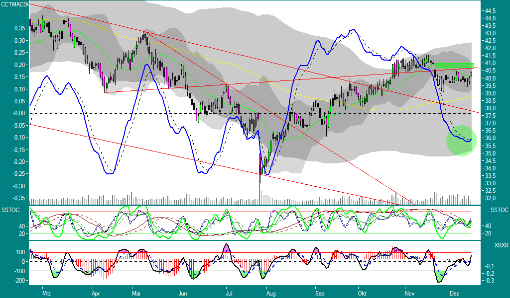 Einstiegsz­eitpunkt nach unten für mich wäre der positive Test der 38 bzw. nach oben das Gapclose und anschließe­nder Test der Trendlinie­ bei ca. 40,75, danach sollte der Weg frei sein.