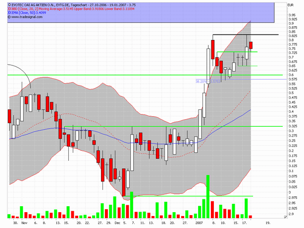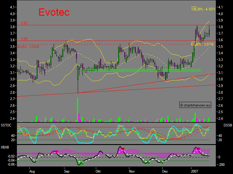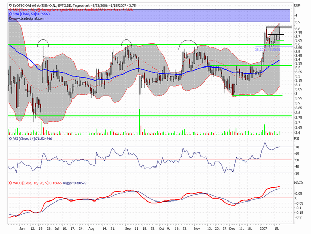 Die Aktie der Firma Evotec befand sich in einer Seitwärtsrange von Juni 2006 bis Januar 2007, welche eine Aufwärtsdreieckformation ausgebildet hat. Diese Formation konnte nun vermutlich zum Abschluss gebracht werden in dem die Aktie den Widerstand bei 3,59 € überwinden konnte.
