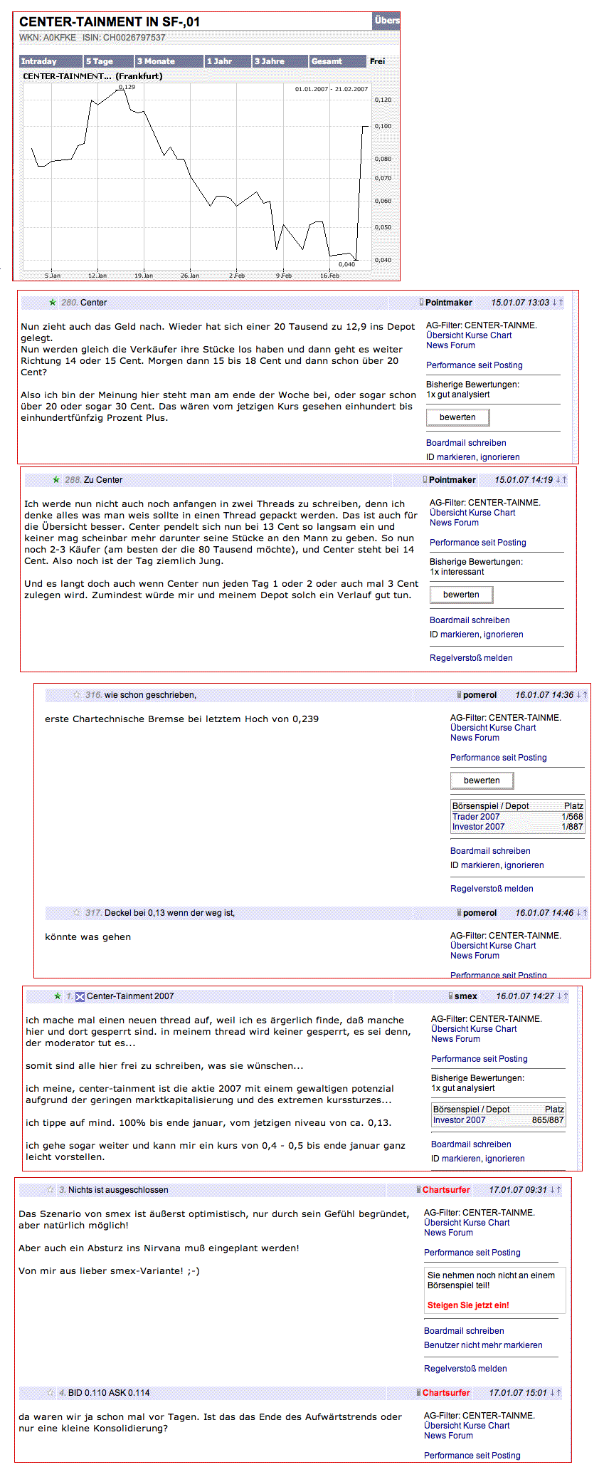 Aber bevor wieder alle vor lauter Begeisterung vergessen, was wirklich passiert ist, und vor allem, bevor sich die falschen Leute mal wieder reflexartig selber auf die Schulter klopfen und sich schon Orden anhängen wollen, sehen wir uns doch mal die Prognosen der "Supernasen" wie smex, pomerol oder pointmaker alias P. Zocker etwas genauer an. Wir lassen einfach mal Bilder sprechen, denn die beweisen, was die Angesprochenen ganz sicher WEIT von sich weisen würden: nämlich ein Szenario, bei dem die o.g. bereits (u.a.) Mitte Januar zum Sturm bliesen, und Gewinne von 1000% genannt wurden. Wie jeder sehen kann, liegt der Schlußkurs von gestern immer noch 30% unter den Kursen von damals - wer also Mitte Januar den Empfehlungen der o.g. gefolgt ist, kann die Euphorie nicht nachvollziehen, denn wie alle wissen, ging es beständig bergab!